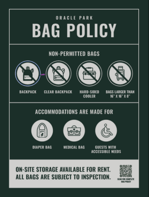 Please bring as little as possible as all volunteers will need to go thru the metal detectors and be processed by security at Oracle Park. Treat this as a game day event - no backpacks or large bags allowed (see image below). There will be a designated staff/ volunteer room but it may not be secure.